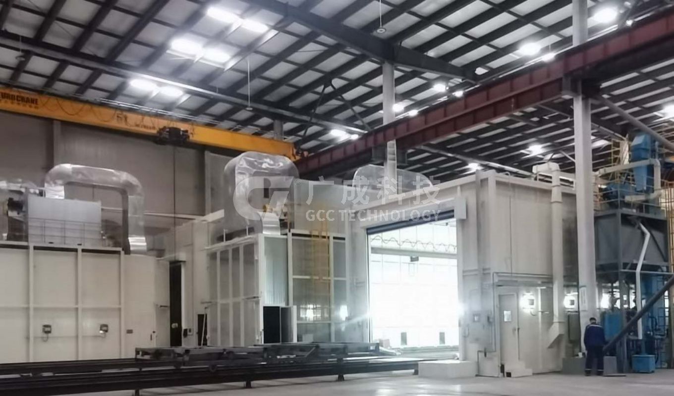 打砂房采用箱式結(jié)構(gòu),配套雙缸四槍連續(xù)加砂噴砂機(jī)、機(jī)械回收系統(tǒng)、除塵系統(tǒng)